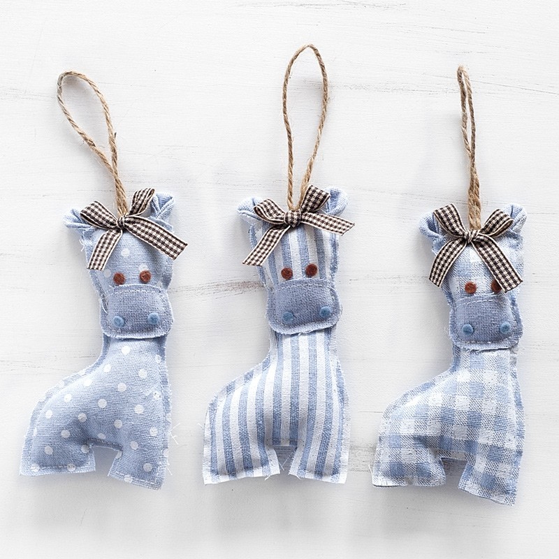 Υφασμάτινη διακοσμητική κρεμαστή καμηλοπάρδαλη σε σιέλ χρώμα με φιογκάκι στο κεφάλι. Ο κωδικός περιλαμβάνει 3 αποχρώσεις (καρό, πουά, ρίγες)