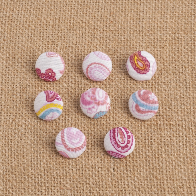 Υφασμάτινα διακοσμητικά κουμπιά με διάμετρο 1.8cm για διάφορες συνθέσεις. Σε εμπριμέ ροζ αποχρώσεις. Κάθε καρτέλα περιέχει 8 τεμάχια.