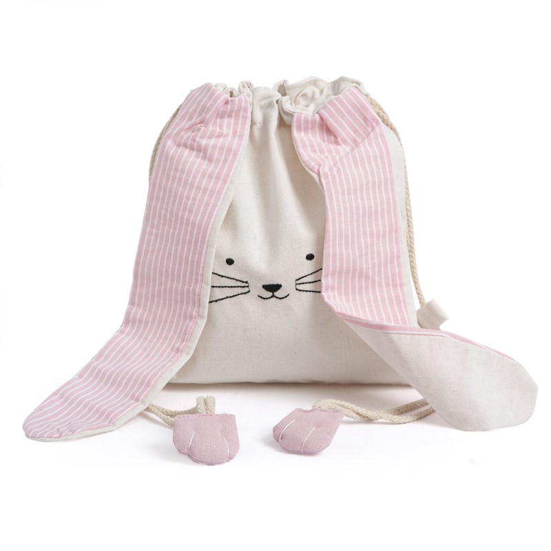 Υφασμάτινο Backpack με σχέδιο κουνελάκι σε εκρού χρώμα με ριγέ ροζ- λευκά αυτιά. Ιδανικό για παιδικό δώρο.
